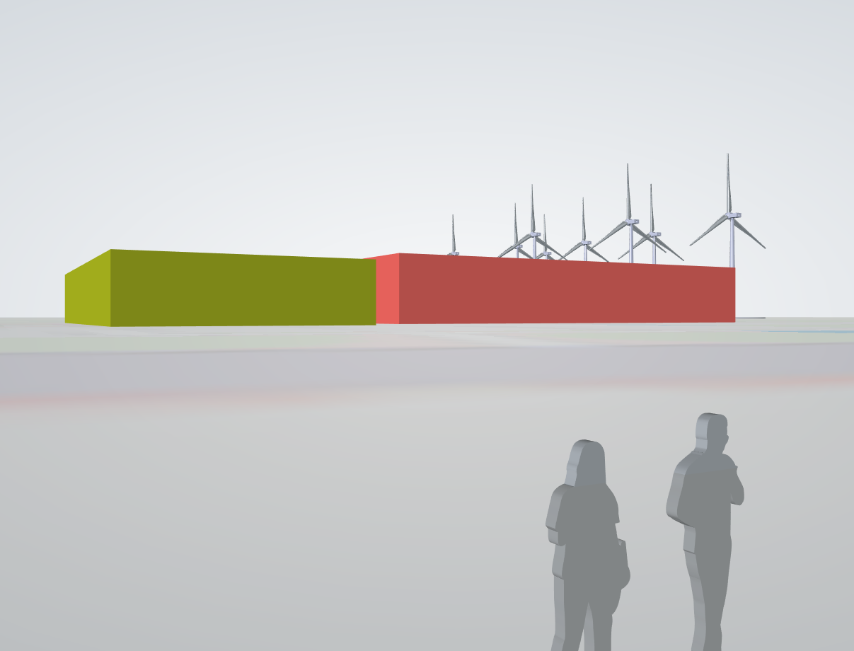 Die beiden halbdurchsichtigen Anlagen rechts sind die in der aktuellen Planung zunächst entfallenen Windkraftanlagen auf der südlichen Fläche.
